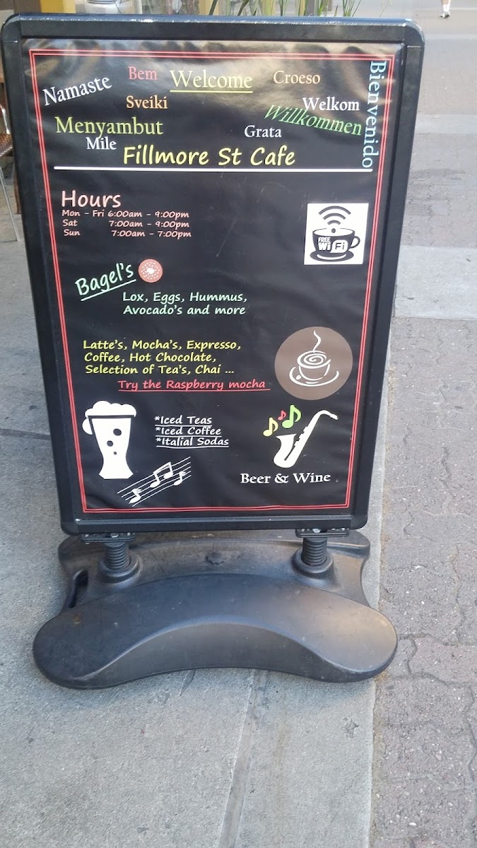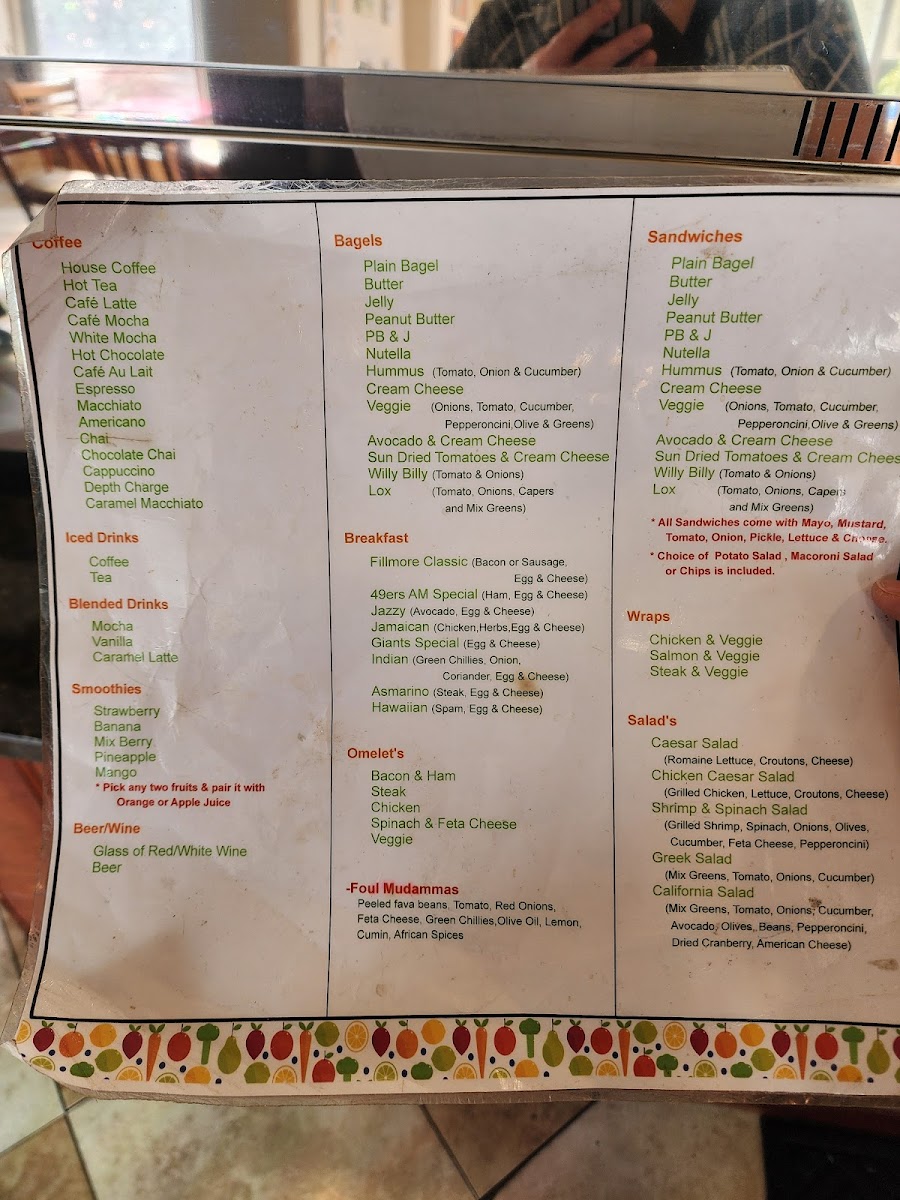 The menu at Fillmore Street Cafe features a variety of options suitable for breakfast, lunch, and casual dining throughout the day. It includes a selection of sandwiches, bagels, and light sides designed to accommodate quick orders or relaxed meals.