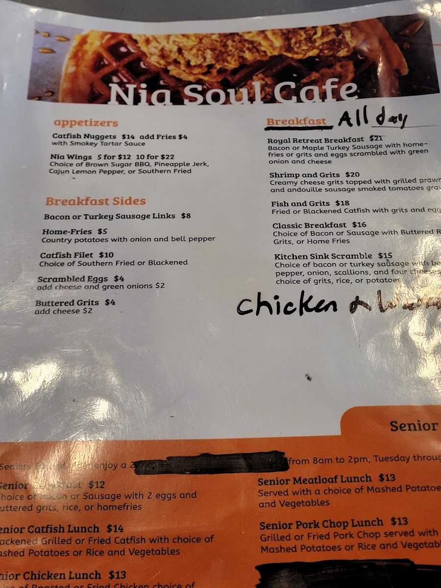 The menu is structured to support both breakfast and light lunch choices, including items like omelettes and salads (noted in menu highlights), alongside coffee and tea selections typical of a cafe and coffee shop setting.